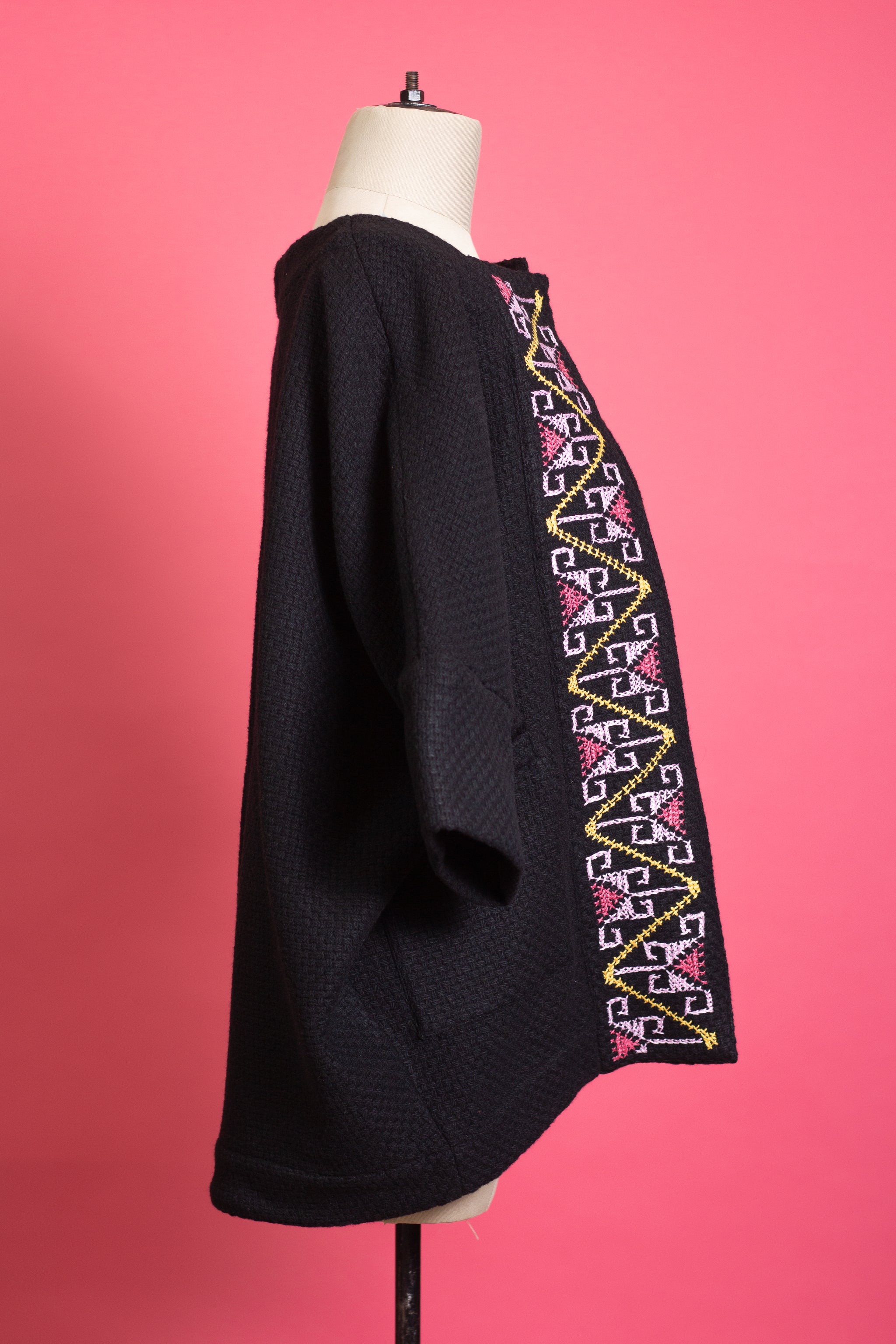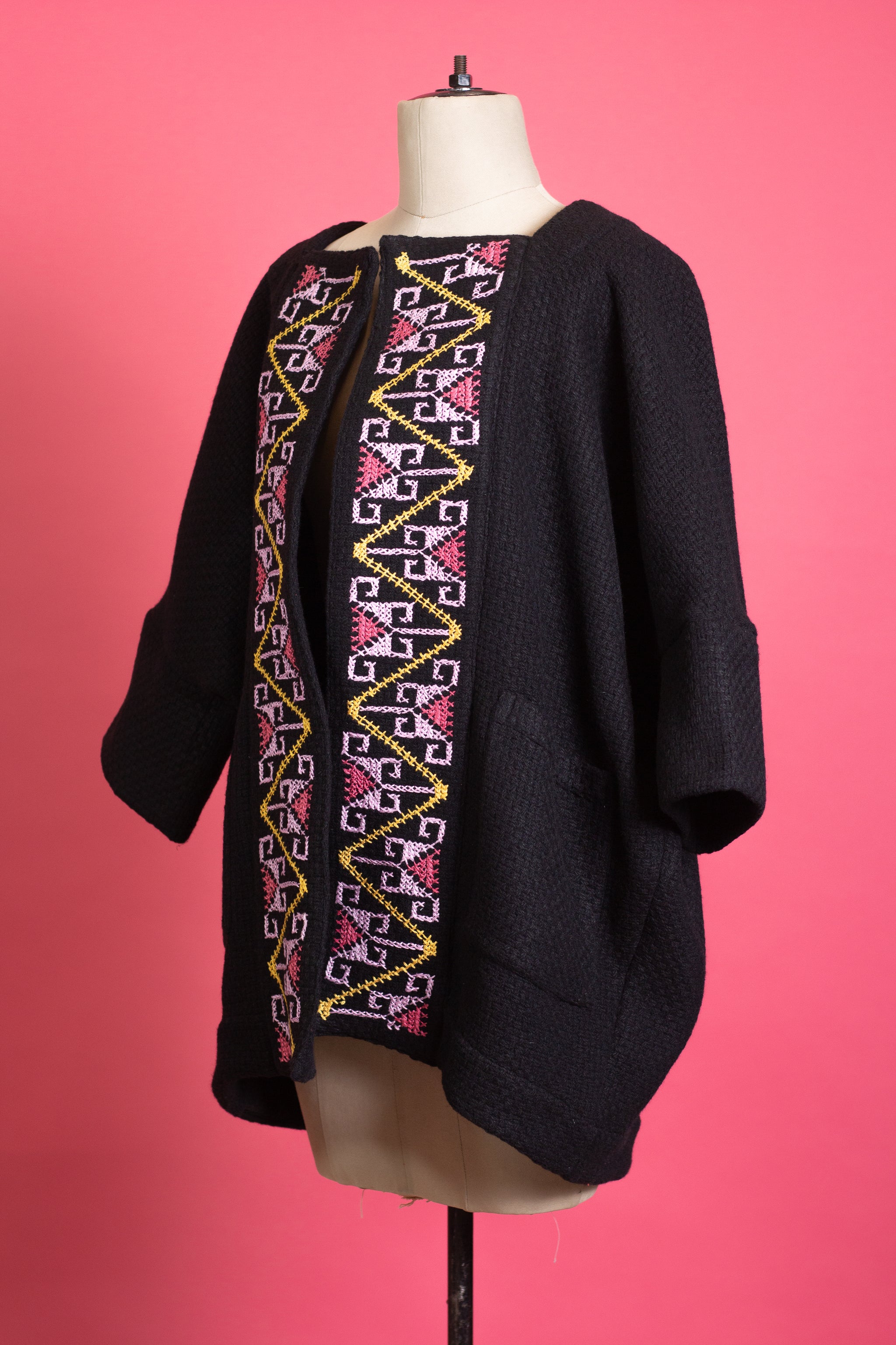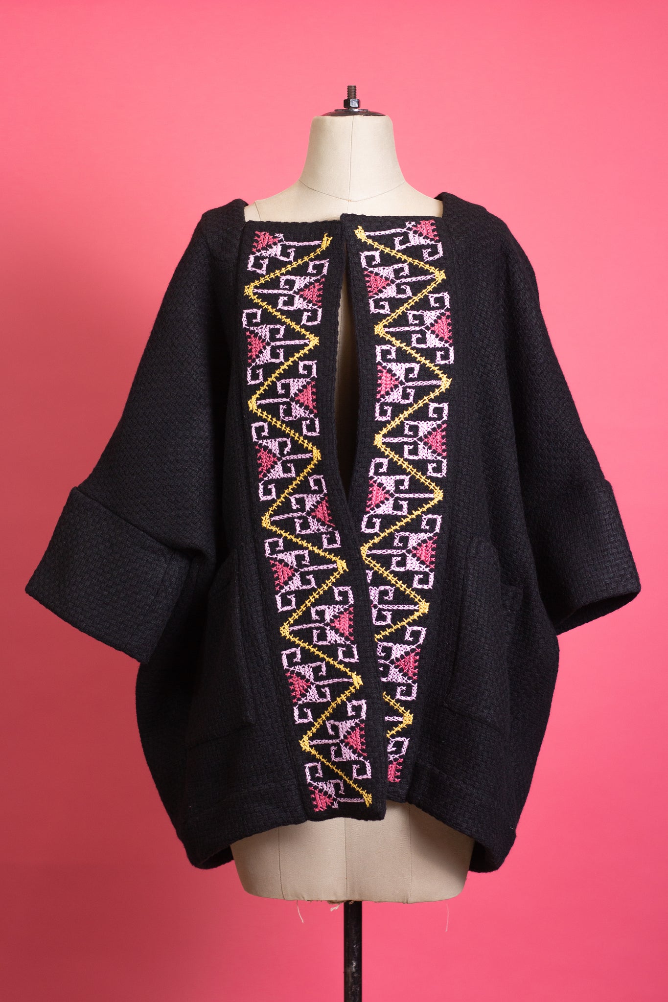 Abrigo 100% lana , bordado a mano en punto de cruz por artesanas nahuas de Santa Catarina, Hidalgo.